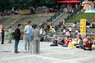 展示五套功法的法轮功学员中,有年轻的上班族,如教师、医生、老板;也有退休的中老年人、家庭主妇等,都是修炼法轮功后身心受益良多,于是利用假日相约到游客多的景点炼功弘法,希望能让更多人们了解法轮功的好处。