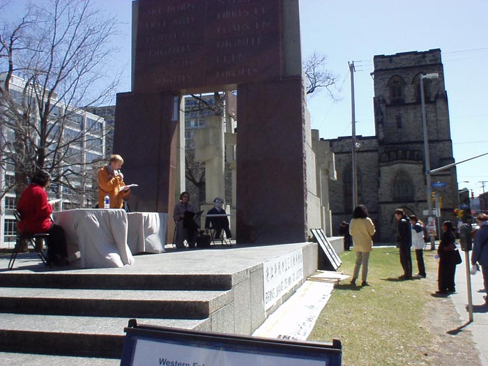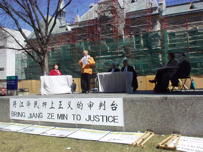 【明慧网2004年4月16日】(明慧渥太华记者冬娜报道)2004年4月15日是“加拿大法律日”。法轮功学员在位于渥太华市政厅的人权纪念碑下,举办模拟审江活动。