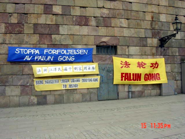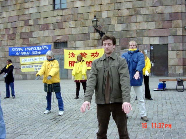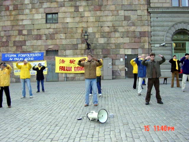 【明慧网2004年4月17日】2004年4月15日,在中国外交部长李肇星访问瑞典期间,部分法轮功学员在瑞典国会门前举行炼功与讲真象活动,呼吁中国停止镇压法轮功,法办