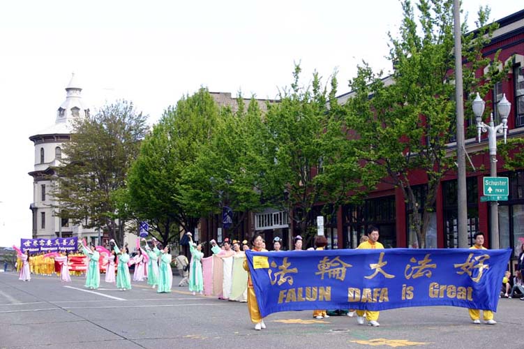 【明慧网2004年4月20日】2004年4月17日华盛顿州举办水仙花节。来自西雅图,加拿大温哥华,和俄勒冈州波特兰的部分法轮功学员参加了4城市(Tacoma,Puyallup,Sumner,Orting)的系列游行。所到之处,赢得了人们无数欢呼和掌声。赢得了人们无数欢呼和掌声并荣获“训练/行进组”(Drill Team/Marching Units)二等奖。