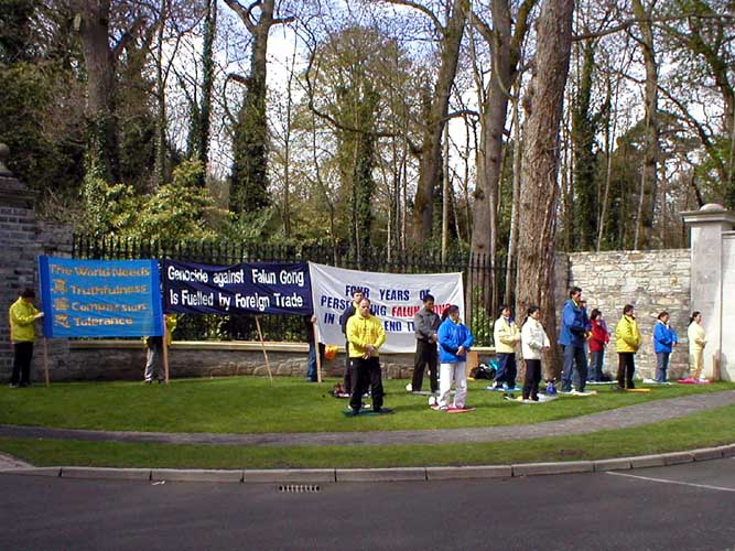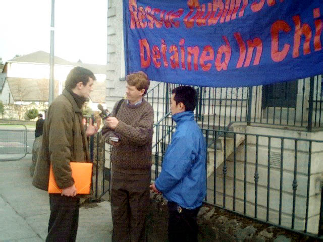 ![]() 法轮功学员在会场外炼功请愿 | ![]() 爱尔兰法轮大法协会发言人基若德-欧康诺接受记者采访 |