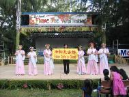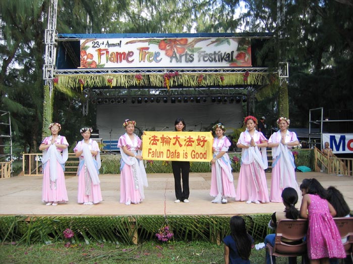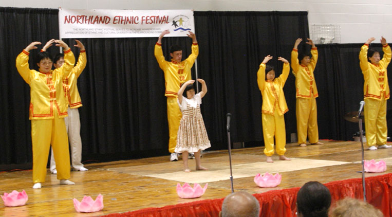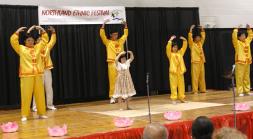 堪萨斯星报图片报导:星期六在北地举办的第一届多元文化节上,8岁的小女孩洛伊斯-邝表演了法轮大法的功法。