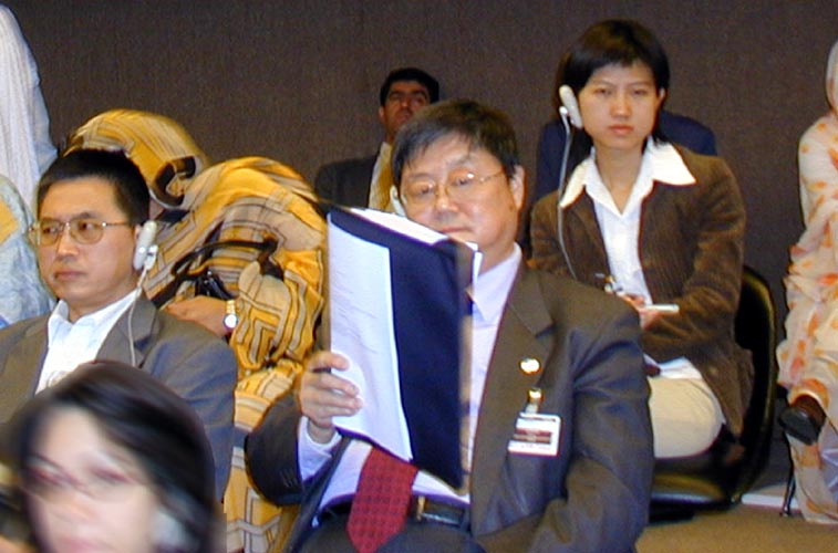 ![]() 王渝生坐在联合国人权大会会场的非政府组织席位上, 他正拿起手中文件夹企图遮挡法轮功学员给他拍照。 请注意王左胸佩戴的是非政府组织的褐色名牌。 在王渝生右侧和后侧两人也是来自中国政府操纵的所谓非政府组织的成员。 |