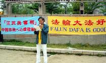 ![]() 学员在游行前炼功 | ![]() 法轮功学员发表声明文 |