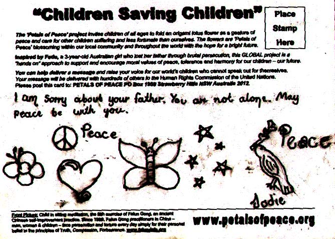 自“和平花瓣”项目在全世界各地开展以来,正跟着妈妈戴志珍女士在瑞士日内瓦参加联合国人权会议的小法度,不断地收到来自澳大利亚各地小朋友的莲花明信片,对因中国(江氏集团)残酷镇压法轮功而失去父亲的小法度表达了他们和平的祝愿。小法度谢谢所有的小朋友。