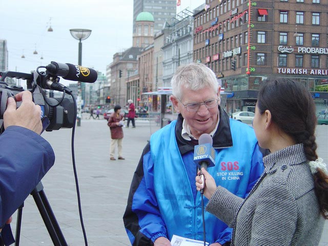 4月24日,瑞典哥德堡大法弟子在市中心繁华地带,模拟审判迫害法轮功学员的元凶江××,以纪念“4.25”五周年。