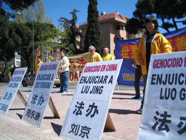 4月25日,西班牙马德里大法弟子来到中国大使馆前和平请愿、发正念、。镶有金边的“法轮大法”横幅和红黄蓝相间的“世界需要真善忍”的横幅在蔚蓝色天空的映照下格外醒目。这一天正值周末,平日里的周末,这里行人十分稀少,然而这次却不同,过往行人很多,并且立即被法轮功学员们庄严、肃穆、和平的场面所吸引。当人们得知真相后,纷纷签名声援,有的人接过传单边走边看,当看明白是怎么回事之后又返回来要求签字并问学员怎样才能更好的帮助法轮功学员……