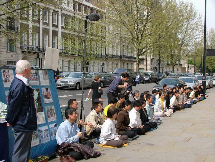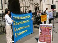4月25日,西班牙马德里大法弟子来到中国大使馆前和平请愿、发正念、讲真相。过往行人很多,被法轮功学员们庄严、肃穆、和平的场面所吸引。当人们得知真相后,纷纷签名声援,有的人接过传单边走边看,当看明白是怎么回事之后又返回来要求签字并问学员怎样才能更好的帮助法轮功学员……