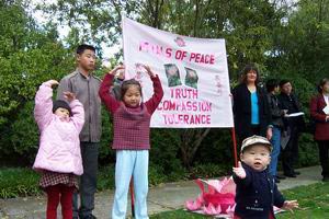 (法度):两年来我和妈妈周游了37个国家。妈妈变卖了家中所有的家产到世界各地奔波呼吁制止迫害,小法度不但洪法和参加游行,向好心的人发真象资料;我还举着爸爸的遗像到过中国驻瑞士的大使馆前讲真象、在和平请愿中我还举起了“真、善、忍”的横幅。