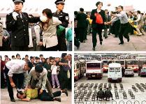 (镜头):法度在寻觅爸爸(伴音乐:小法度要爸爸)、大法弟子在天安门被抓捕的镜头。图片的一角显示一张法度母女的对话。