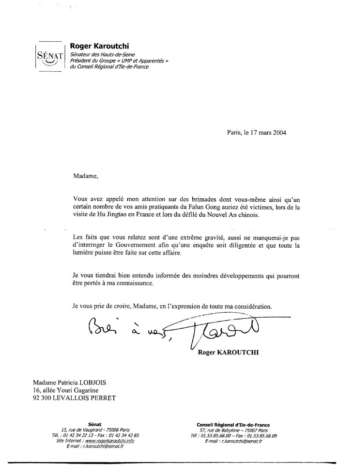 两名法国议员在信的最后都向法轮功学员们致以“最良好的崇高敬意”。
