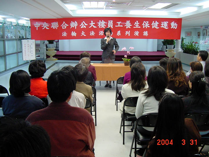 台湾文化大学法轮佛法研究社于2004年3月29日至4月2日期间举办「法轮大法真象图片展」,吸引了许多教官、老师及行政人员前来参观了解。展出的五天,法轮功材料时常被索取一空。了解法轮功在大陆被江氏集团镇压真象后的师生们,对该社团表示感谢与支持,并希望大家共同凝聚善的力量,将在大陆受迫害的法轮功学员尽早援救出来。