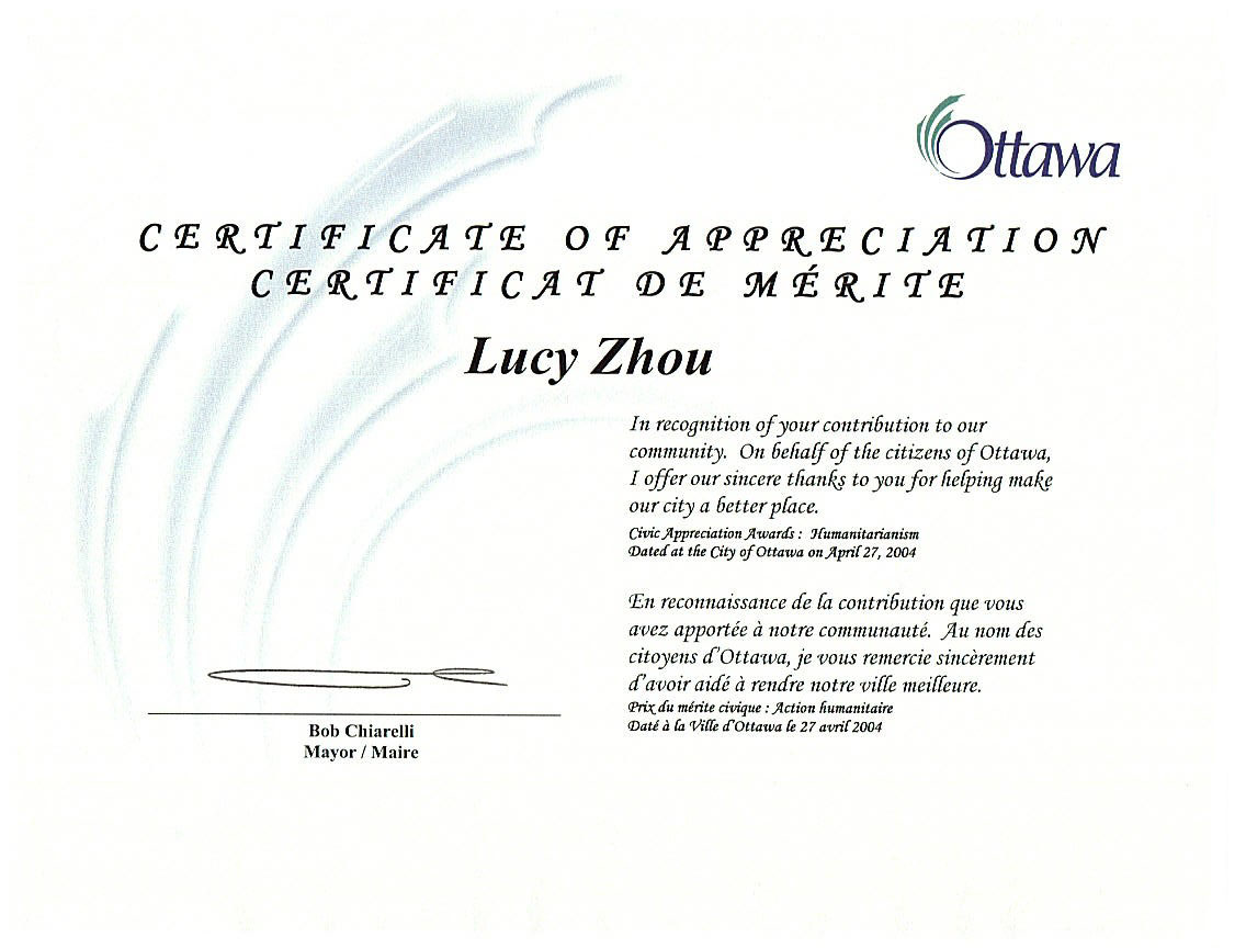 ![]() 周女士与所在选区市议员派姬-法特梅特女士(Peggy Feltmate)在颁奖仪式上合影。 | ![]() 渥太华市长签署、颁发的奖状。 |