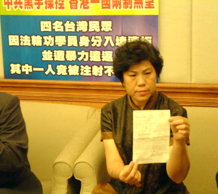简鸿章指出,来自台湾的三女一男原本打算参加本周六起在香港举行的为期两天的法轮功会议。但当四人于28日抵达香港后,移民当局援引「安全理由」拒绝让他们入境。 简鸿章表示,香港官员对四人进行搜身和检查其行李后,将他们分别送上飞往台北和高雄的班机。 简鸿章并宣称,一名官员曾向其中一名妇女的腿部注射不明药物。