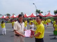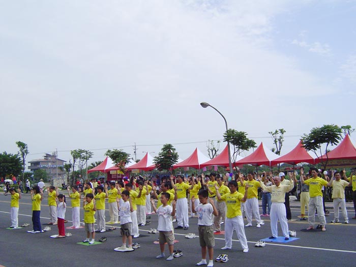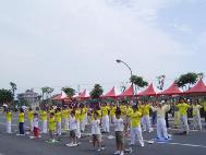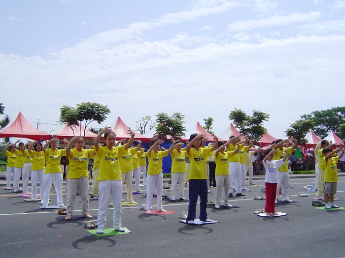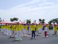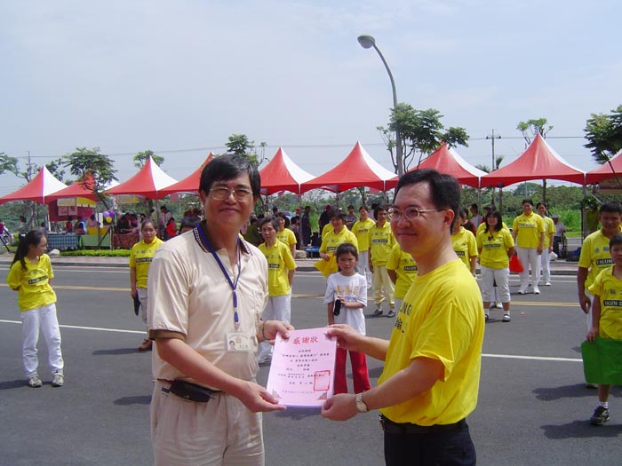 上午十时许,学员们整齐的進入会场,向大家展示法轮大法优美柔和的五套功法。虽然播放音乐的放音机中途故障,但担任解说的学员立即以喊口令代替炼功音乐,使功法表演顺利進行。他更利用无音乐反而有较多旁白时间的机会,向来宾介绍大法洪传和迫害真象,并谈到了江泽民在多国遭起诉的现况。功法表演后,该院院长颁发感谢状,并和副院长亲自到法轮功的摊位向学员们致意并合影留念。