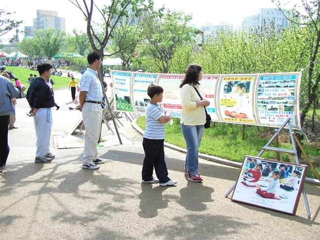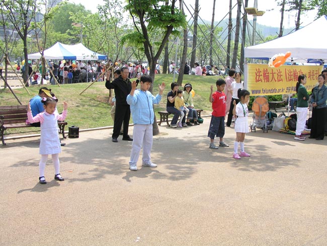 我们的展台除了有大法的资料以外,还根据孩子们的特点,放了一些精美的印着小弟子炼功场景的书签。这些书签也得到了孩子们的青睐,纷纷来索取。最有趣的是有一个蹒跚学步的小宝宝,也拉着父母来到摊位前,伸出胖胖的小手拿一张书签,再拿一份资料,书签自己留着,资料递给了父母。看着那个可爱的认真样,使在场的每一位同修都感受到众生都在等待大法,我们会做的更好。