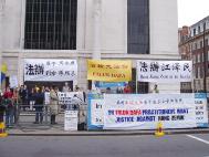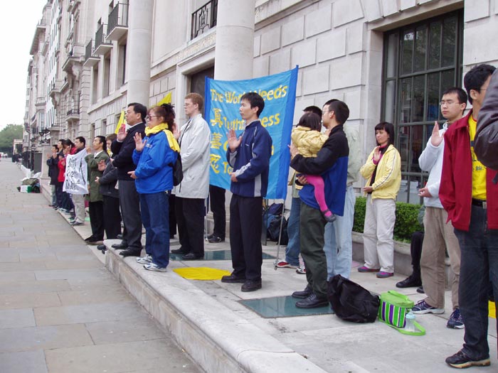 法轮功学员们静静的坐在领馆对面发正念,同时播放着法轮功学员创作的歌曲:“法轮大法好”、“为你而来”、“SOS,走吧”和“普度”。整个场面庄严肃穆。那一声声“法轮大法好”“我因为爱你而来”的歌声带着大法的慈悲和威严,震撼着在场的所有人。这是法轮大法弟子对所有的中国人发自心底呼声:“切莫相信那欺世的谎言!”