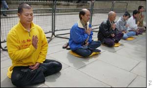 法轮功学员在中国驻伦敦大使馆外静坐抗议报导说,星期一,一些法轮功学员在伦敦唐宁街抗议。前一天另有150名学员在中国驻伦敦大使馆前静坐请愿。法轮功遵循真善忍原则,净化身体和心灵,提高道德精神水平。