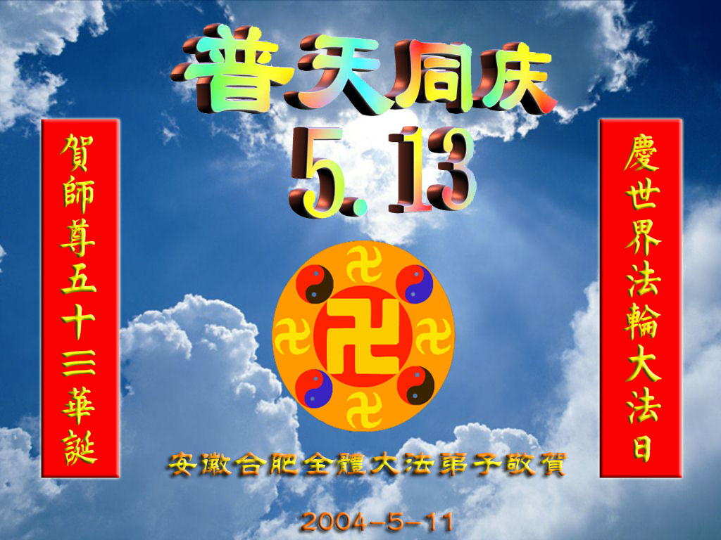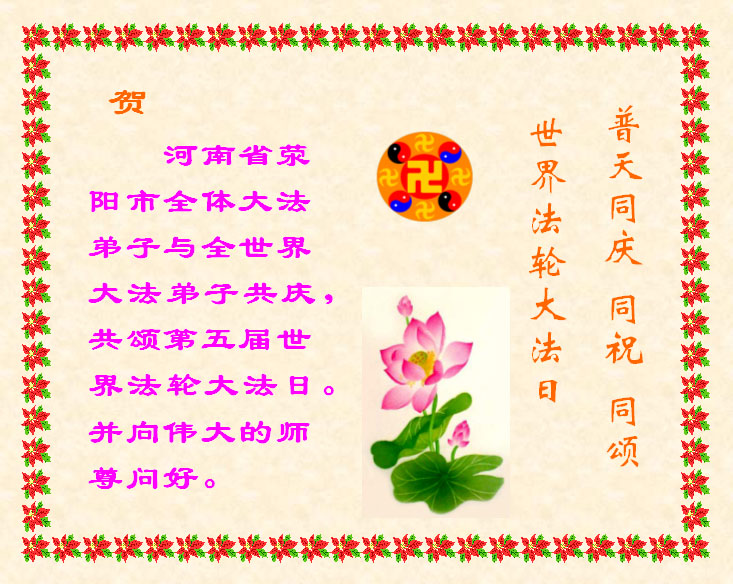 河南省荥阳市全体大法弟子与全世界大法弟子共庆,共颂第五届世界法轮大法日。并向伟大的师尊问好。