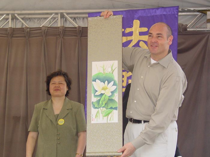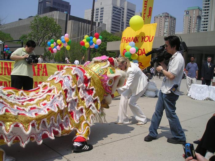![]() 给前来支持的安省卫生部长赠送学员自己的艺术作品 | ![]() 观看表演的人们 | ![]() 广场上的图片展 |