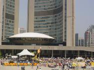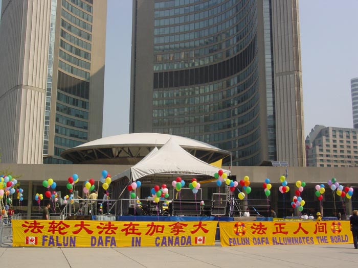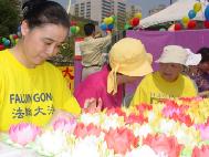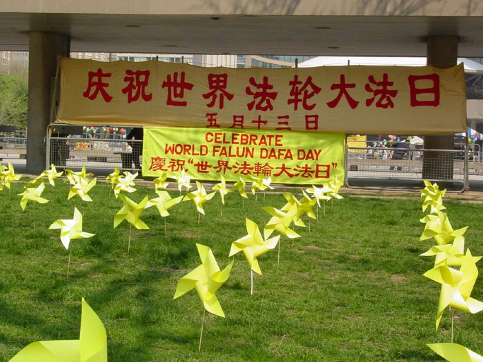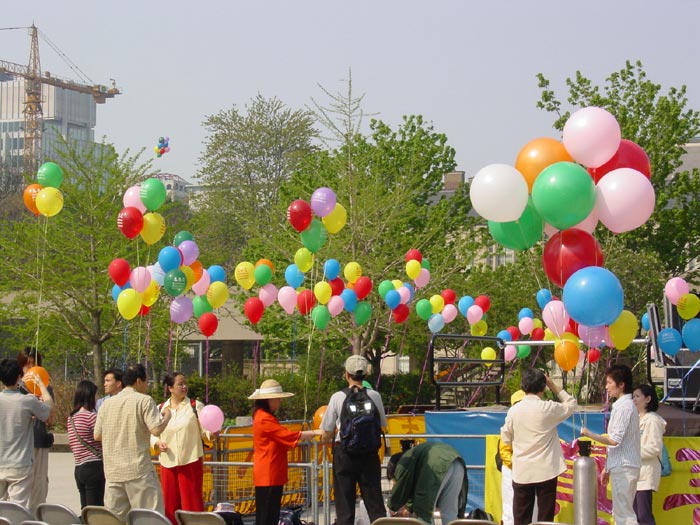 ![]() 忙着装点广场的法轮功弟子 | ![]() 装点一新的市政广场 | ![]() 千纸鹤代表着美好的祝愿 |