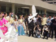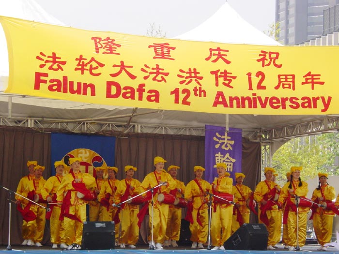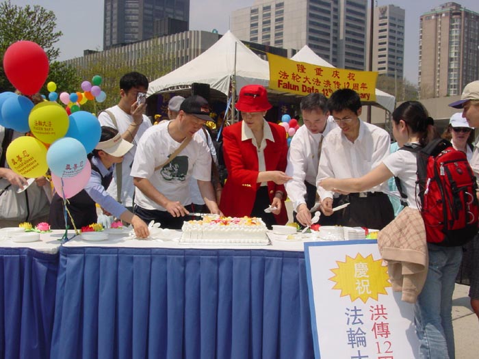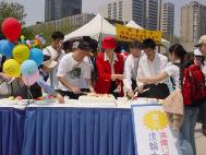 ![]() 分享节日的蛋糕 | ![]() 威风腰鼓更喜庆 | ![]() 放飞的白鸽代表对被迫害致死法轮功学员的追思 |