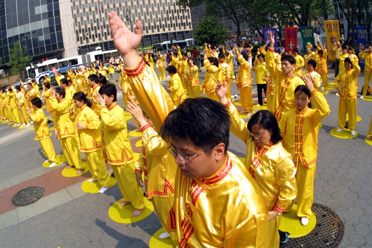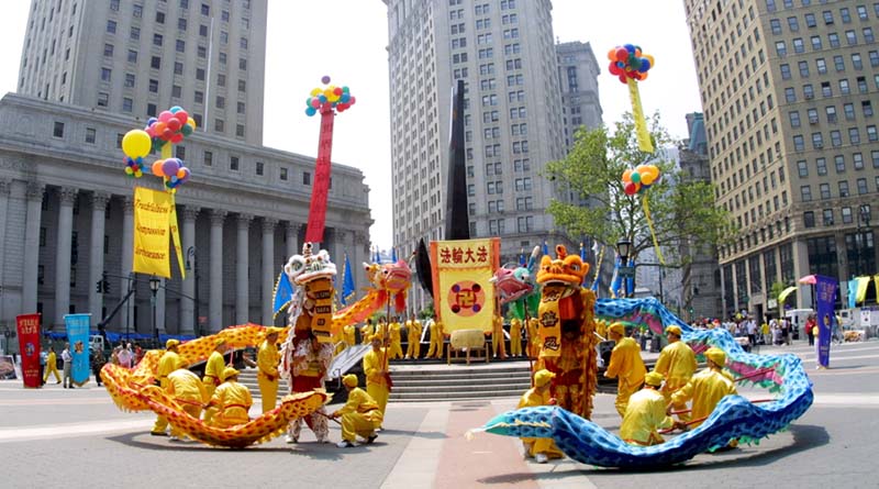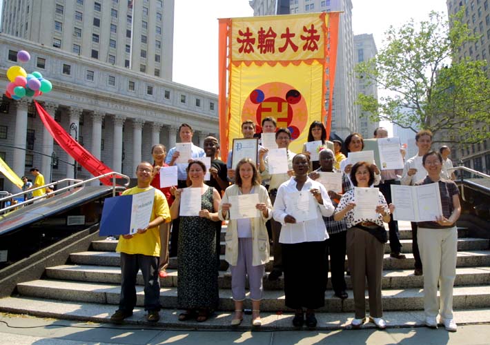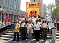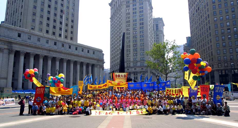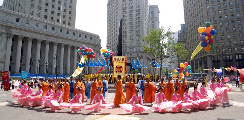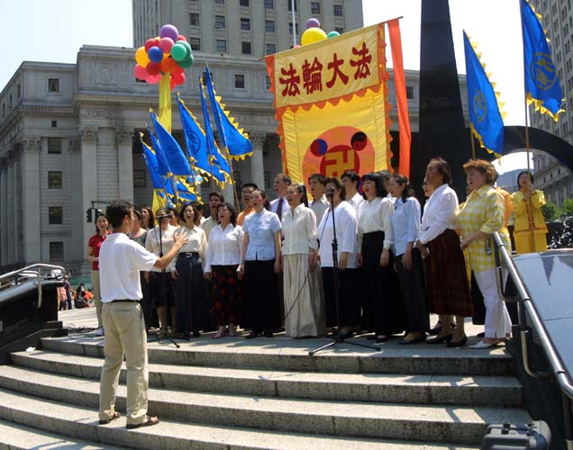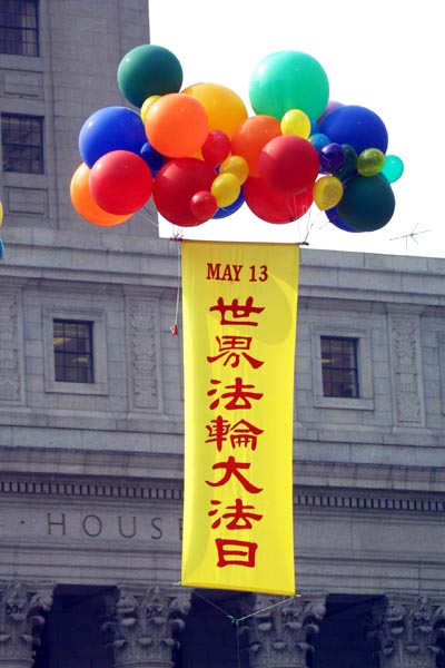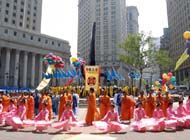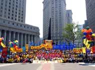今天,2004年5月13日,大纽约地区的法轮功学员来到纽约市曼哈顿下城的Forley广场隆重庆祝第五届世界法轮大法日,敬谢师尊佛恩浩荡。