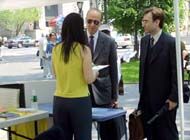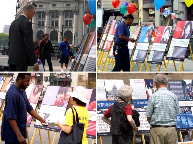 演示迫害真象,模拟公审江泽民引起了人们的注意,人们被酷刑演示所震惊,聆听着学员们的证词。一位路人说“你们模拟演示很有力量,迫害必须停止。”