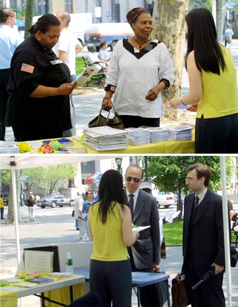 来往的人流被欢乐的节日气氛所吸引,不论是西方人还是中国人纷纷停驻,询问,观看,浏览,拍照。两位老师特地把孩子们带到庆祝现场看表演。有些路人询问炼功点,有些路人当场要求学功,有位中国人希望继续参加在法拉盛举行的庆祝活动。路人不时地发出赞叹“太美了”。