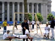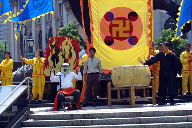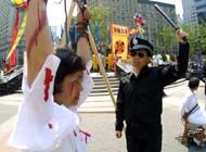 今天在Forley广场,模拟了针对这场江××无人性迫害的审判。四位证人以真实的经历确凿的证据向法庭诉说了江××对法轮功学员犯下的滔天罪恶,起诉了江××挟持整个国家机器,操纵一言堂媒体,以利益为诱饵,威逼整个民族在“真善忍”的信仰面前出卖良心,道义,扭曲人性。