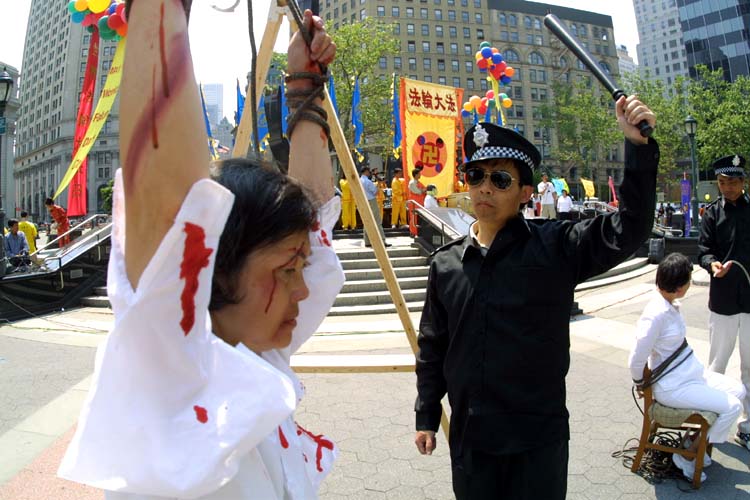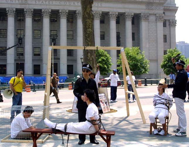 广场上真实模拟了恶警用酷刑“坐铁椅子”、“惩罚性灌食”、“坐铁笼”、“长时间吊打”折磨大法弟子的场面。