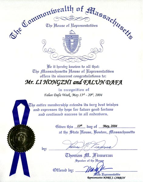 马萨诸塞州众议院向李洪志先生和法轮大法致以最衷心的祝贺!