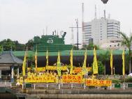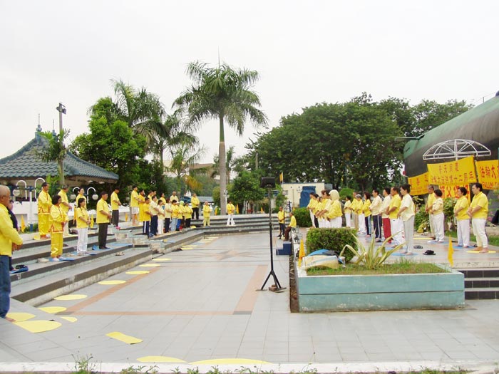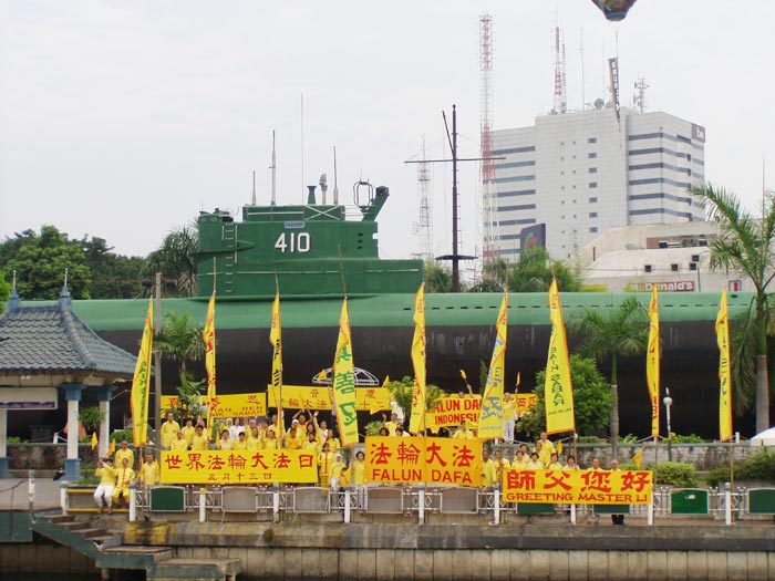【明慧网2004年5月15日】印尼东部地区大法弟子于2004年5月13日清晨在泗水市中心的潜艇纪念馆集炼功洪法,欢庆世界法轮大法日,共贺师尊华诞。