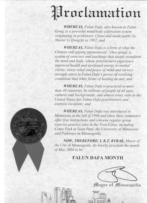 鉴于,法轮大法于1998年秋季传入明尼苏达州,自那时起,义务教功者们在双城(twin cities)提供免费教功,组建固定炼功点,包括圣保罗(St. Paul)的康莫公园 (Como Park),明尼阿波利斯的明尼苏达大学及帕斯维斯 (Pathways)。