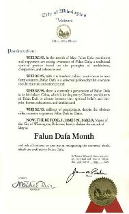 美国特拉华州威明顿市颁发“法轮大法月”褒奖
