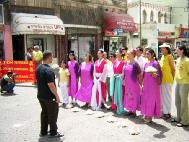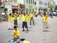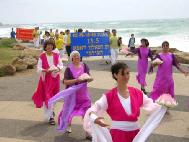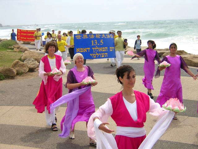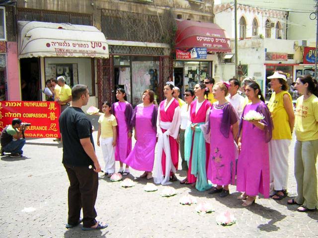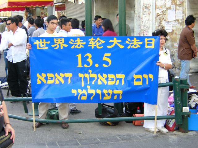 【明慧网2004年5月17日】以色列各地的学员们在周末期间庆祝法轮大法传世12 周年。学员们在特拉维夫城人群熙攘的地方游行。他们在街上演示功法、跳舞和歌唱。街上的人们被大法的美好所吸引,纷纷索要有关大法和发生在中国的