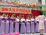 “今天法轮大法弟子们再一次与善良的人们一起欢聚,庆祝法轮大法传世12周年,庆祝法轮大法给人类带来的福音。在各式各样的庆祝活动中,我们愿把对法轮大法的感激化作对普天下善良人们的祝福。