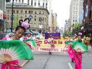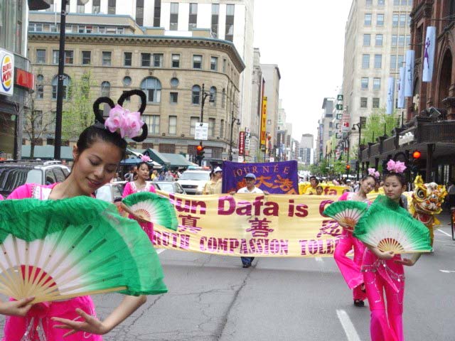 中午12点半在中国城表演节目之后,下午4点至6点,法轮功学员们在市中心大规模游行,受到人们的欢迎。