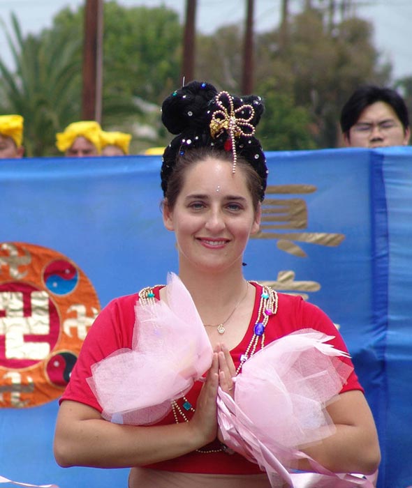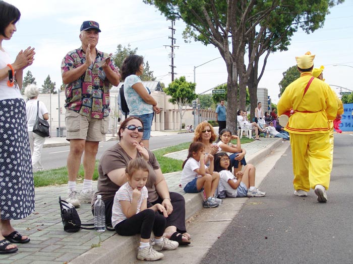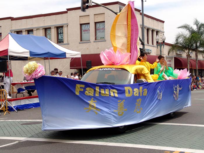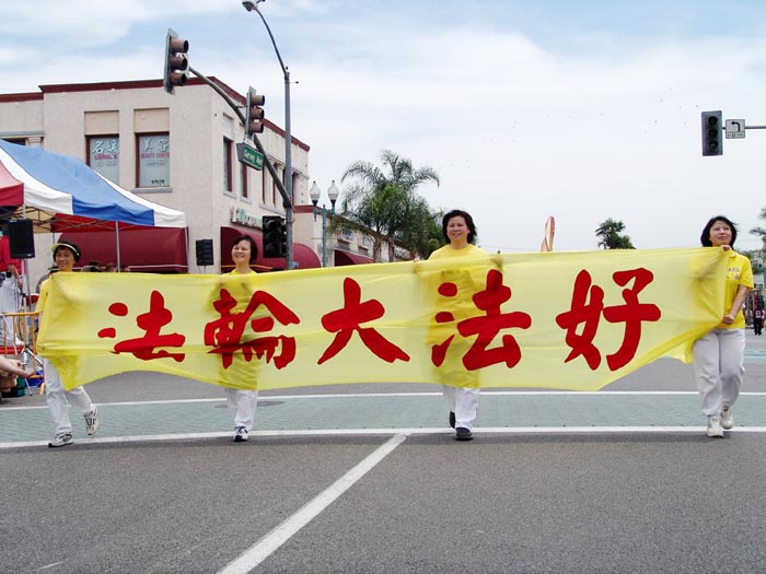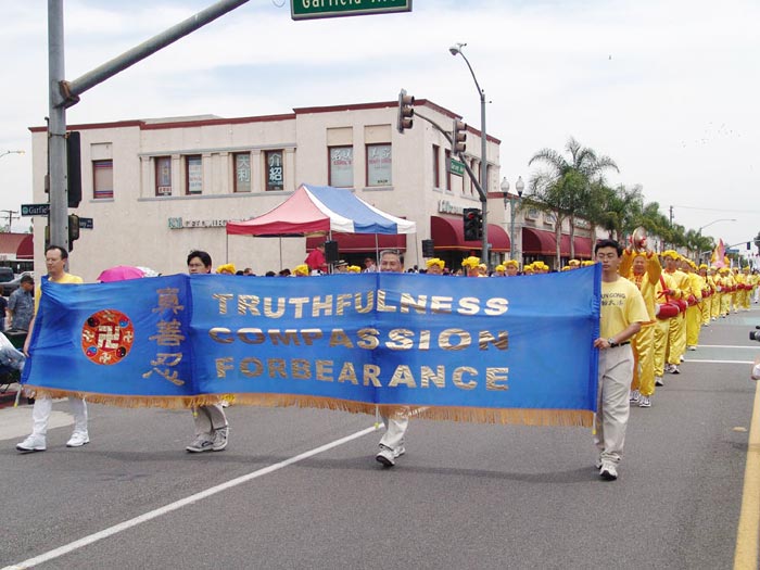 「法轮大法也称作法轮功,是修炼真善忍的,是一种有利于身心健康的功法。看,他们的队伍多么美丽!」当游行队伍经过主席台前时,主持人在广播中向观众介绍着法轮功。