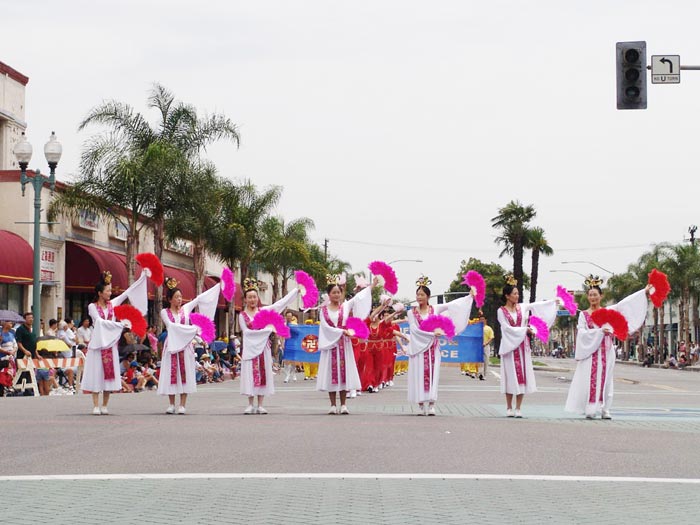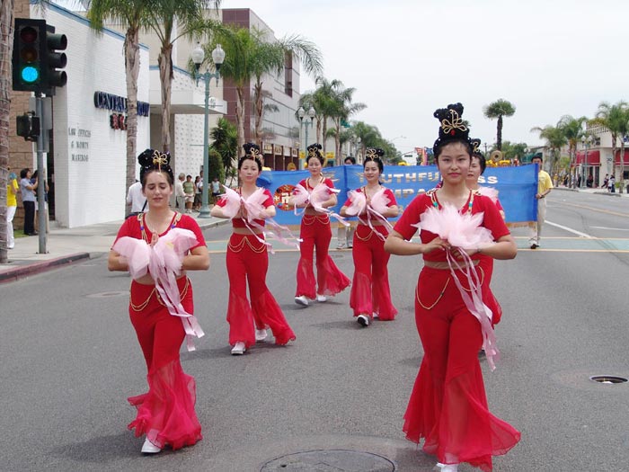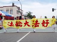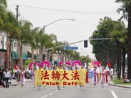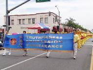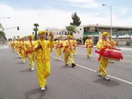 法轮功队伍被称为阵容最庞大的队伍,由仙女舞蹈队、腰鼓队和花车组成。碧天丽日之下,黄底红字的「法轮大法」、「法轮大法好」及蓝底金字的中英文「真善忍」大横幅分外醒目。翩翩起舞的仙女、威武雄壮的腰鼓,以及花车上的功法演示,把真善忍的美好带给大众。沿途的观众报以热烈的掌声、欢呼声。