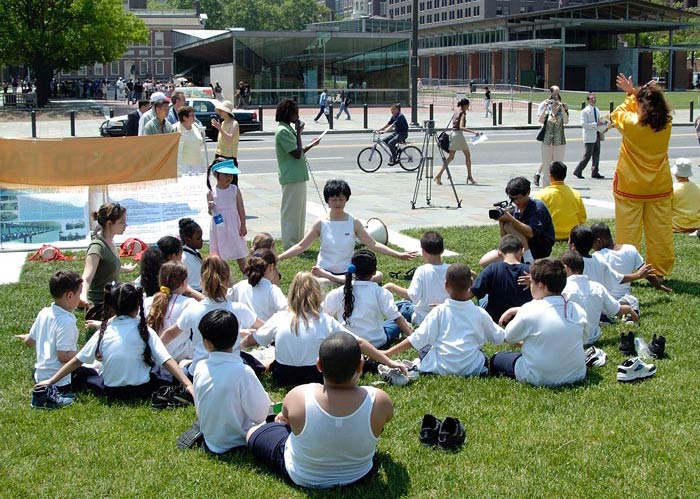 带着十几个小学生游览历史名胜独立宫的费城Hopkinson 小学老师Pamela Roy看到很多人在打坐,也带着她的学生们一块儿学了起来。Pamela和几个小朋友都能双盘打坐。她说:“感觉棒极了,对学生们来说这是很好的经历,回去后要接着教学生们学。”她说学生们应该学习“真善忍”。还有一对夫妻从报上看到这次活动的预告后,专门从新泽西州赶来,想要学功。