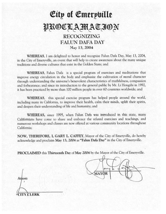 现在,我,加里-卡非(Gary L. Caffey),艾莫利威尔市(Emeryville)市长,特此褒奖2004年5月13日为艾莫利威尔市“法轮大法日”。