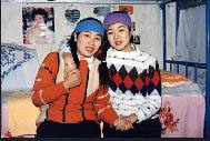 彩色照片中右面戴紫色头套的是王文君,左面戴蓝色头套的是她的妹妹王文娟,姐妹俩都修炼法轮功,现在姐姐已被迫害致死,妹妹仍被关押在马三家劳教所遭受迫害。