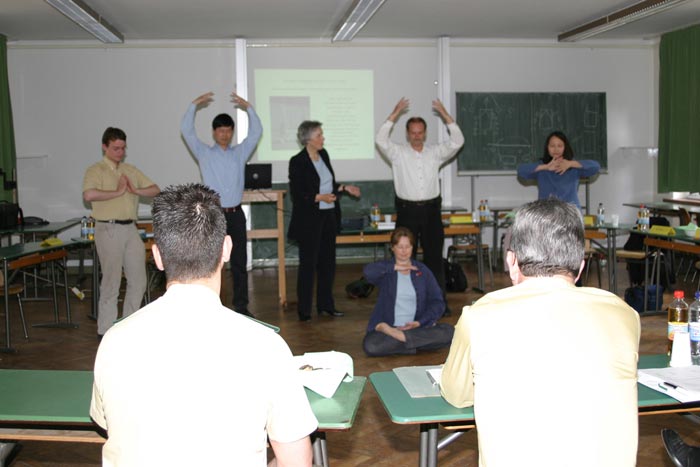 在长达三小时的会议当中,柏林法轮功学员通过大量的图片为警备局的警官们介绍了法轮功修炼的起源和特点、在中国和世界各国的传播情况以及自99年7月以来法轮功学员所遭到的迫害情况和学员们为反迫害而做出的努力。五位中西法轮功学员为警官们展示了法轮功的五套功法。