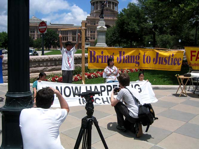 中午时分,“支持诉江汽车之旅”抵达德州的首府奥斯汀,同当地和圣安东尼奥的学员一同举行了新闻发布会,揭露江泽民对法轮功学员的惨无人道的迫害,同时,还举行了对江泽民的象征性公审,两位法轮功学员展示了中国监狱中的酷刑。