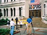 10点钟的时候,德州法轮功学员在市政厅前的小广场上做准备工作时,当地的CBS电视台就已提前10多分钟赶到,静候学员们摆展板。不久FOX当地台的记者也匆匆赶来。