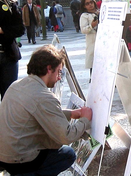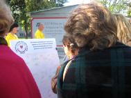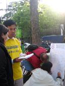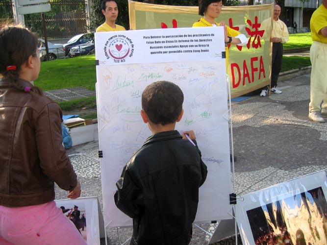 学员们在这里摆放正法之路图片,从1992年大法开传、在中国大陆遍地开花、上亿人修炼大法的壮观场面到1999年江邪恶集团对法轮功的全面镇压,大法弟子遭受种种酷刑折磨,从海内外大法弟子坚持不懈的和平抗争请愿,到大法迅速传遍全世界……一张张记述着历史真象的图片深深震撼着每一位参观者的心。每一位听到真象的人,都毫不迟疑的在签字图版和签名表上签字表示支持与声援,他们中有的是一家人都来签,有的是相约而来的同学一起签,也有的是一对情侣两人同签;他们中有历经沧桑的老人,也有稚气未脱的孩童,一名坐在轮椅上的病人在经过受迫害图片时,顾不上亲人的搀扶,挣扎着走下轮椅来到签字图板前写下了自己的名字……他们发出一个共同的心声:停止迫害!