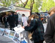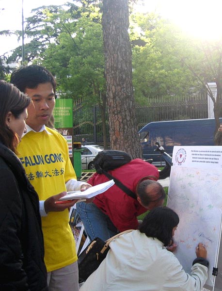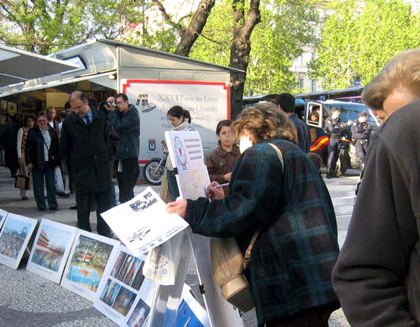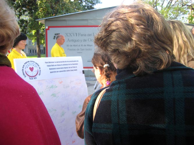 5月13日,马德里大法弟子来到位于马德里市中心大道的图书展销会洪法、炼功、讲真象。大法弟子在书展入口处申请了场地,这里正处于东西、南北大道交界处,又是旅游名胜景地,来往行人、外国游客以及书展参观者众多。