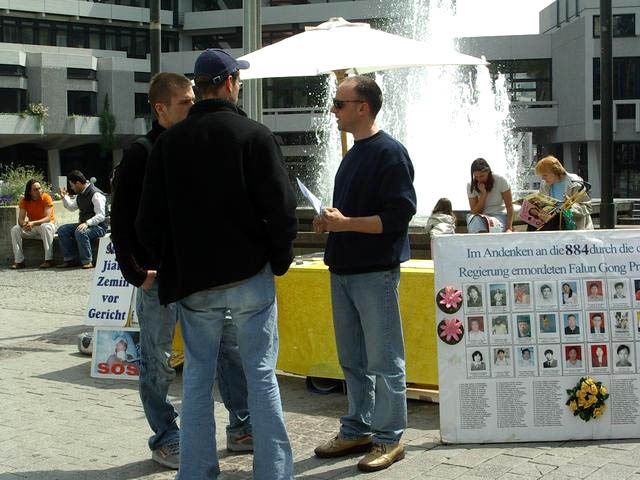 在讲座進行的同时来自卡尔斯鲁尔(Karlsruhe)的法轮功学员在市中心的市场广场上举办了关于中国人权问题的信息日。他们向对此感兴趣的人们分发了很多德文资料。法轮功五套功法引起了行人们的极大兴趣,人们纷纷驻足观看。很多人在一个呼吁释放一名德国大法弟子的母亲徐幼林的征签表上签了名。下午来了两个聪明活泼的男孩,想马上学习五套功法,而且在学第五套功法时,两个活泼好动的孩子都能静静地闭目坐很长时间,他们走的时候把所有的德文资料都拿了一份。