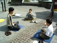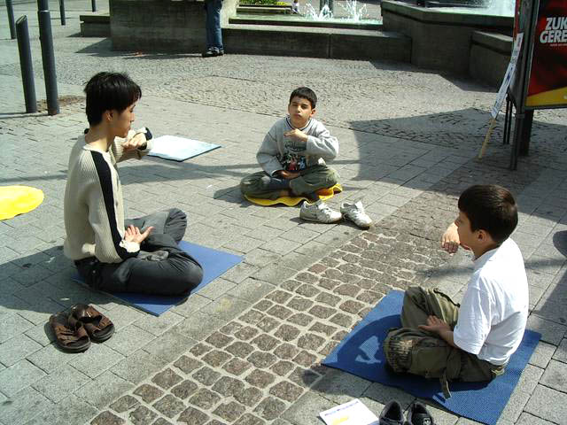 ![]() 在法轮功讲座上,听众认真学炼功法 | ![]() 在卡尔斯鲁尔市中心洪法 | ![]() 认真学炼功法的小男孩 |
